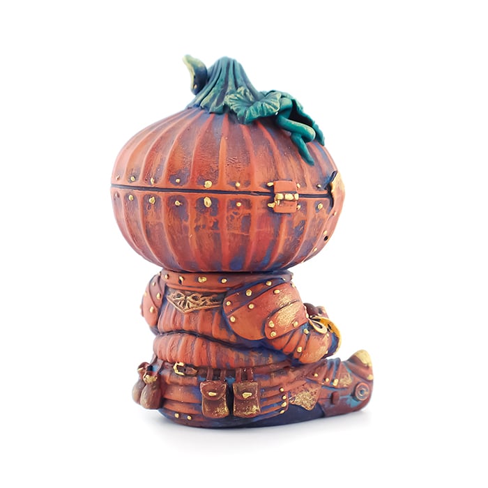 This pumpkin knight is a resin cast, hand-painted, one-of-a-kind figure. Comes with a Siegbrau accessory and sits about 2.5" tall.