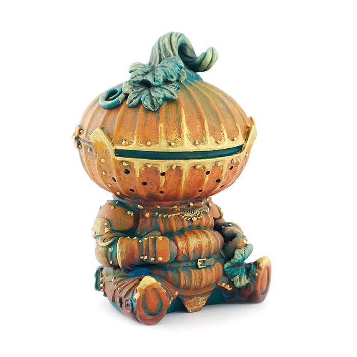 This pumpkin knight is a resin cast, hand-painted, one-of-a-kind figure. Comes with a Siegbrau accessory and sits about 2.5" tall.